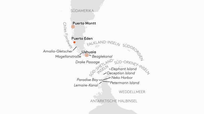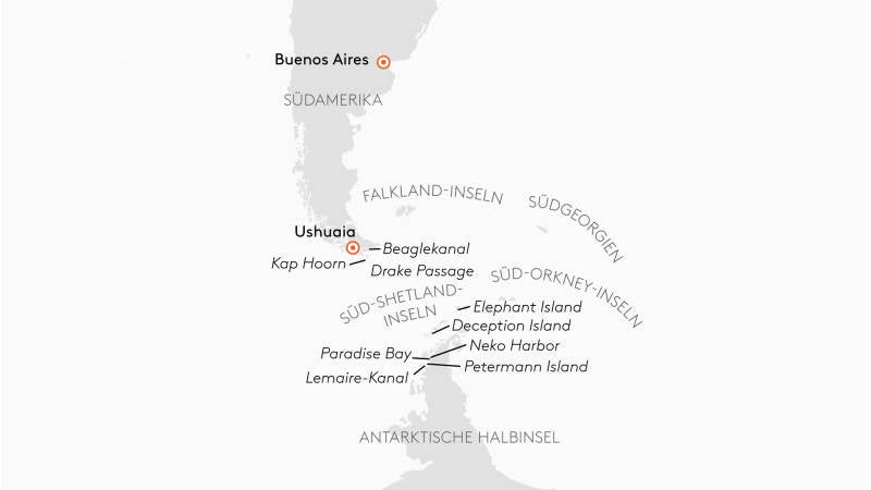 Route: Buenos Aires, Argentinien – Ushuaia, Argentinien – Falkland-Inseln, Großbritannien - Südgeorgien, Antarktis – Süd-Orkney-Inseln, Antarktis – Fahrt durch die Drake Passage - Fahrt durch den Beagle Kanal – Fahrt durch die chilenischen Fjorde – Puerto Montt, Chile